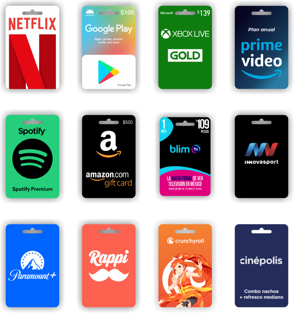 Ofrece en tu negocio mas de 30 tarjetas electrónicas como Google Play, Netflix, Xbox, PlayStation, Spotify, Prime Video y obtén una comisión por cada tarjeta que vendas